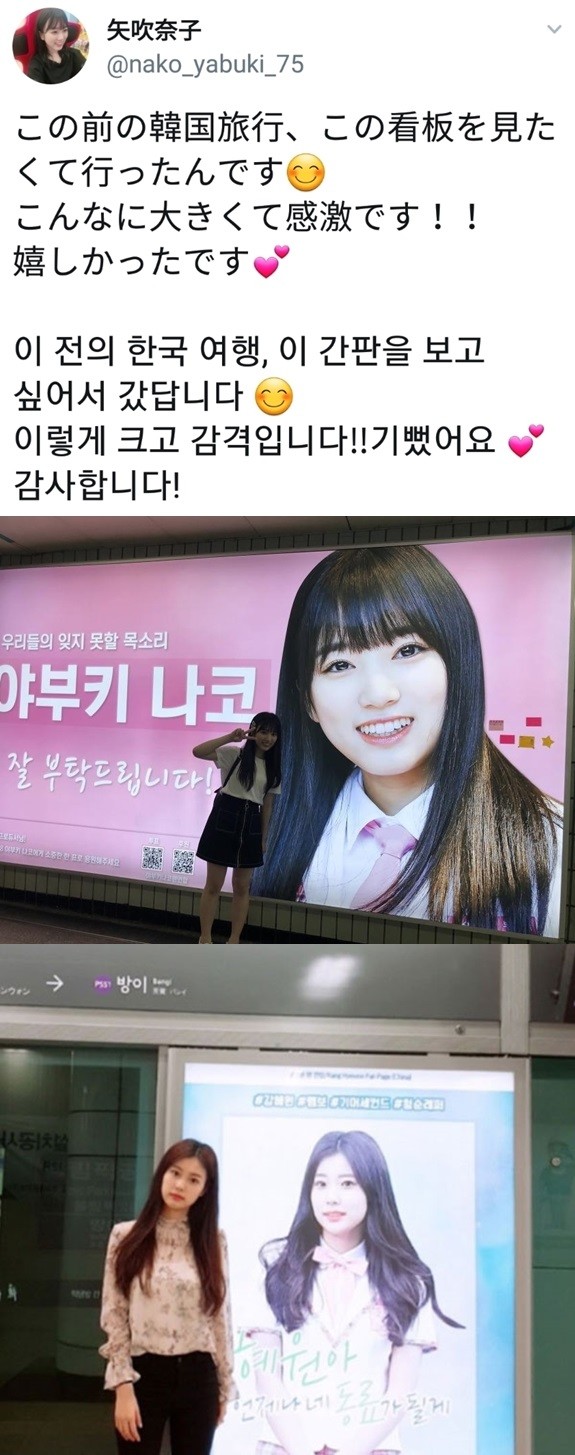 최근 야부키 나코는 자신의 SNS를 통해 "이전의 한국 여행, 이 간판을 보고싶어서 갔답니다. 이렇게 크고 감격입니다. 기뻤어요. 감사합니다"라는 글과 함께 여러 장의 사진을 게재했다.