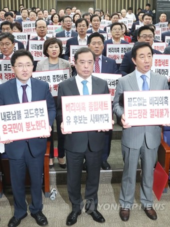 19일 오후 국회에서 열린 자유한국당 긴급의원총회에서 김병준 비대위원장, 김성태 원내대표 등 의원들이 유은혜 부총리 겸 교육부장관 후보자의 자질이 부족하다며 후보자 사퇴를 촉구하고 있다.