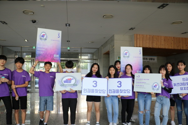 | ▲ 기호 3번 '인권을찾았당'에 소속된 청소년들이 피켓을 들고 기념촬영을 하고 있다. | ||