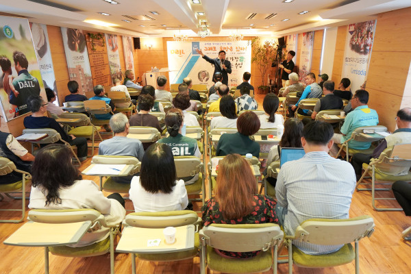 19일 유덕열 서울 동대문구청장이 다일천사병원 시설 입소자·주민 50여명을 대상으로 다일문화대학에서 ‘그래도 희망은 있다’라는 주제로 특별강연을 펼쳤다. 사진은 인문학 특강을 진행하고 있는 유 구청장의 모습. (사진제공=동대문구청)