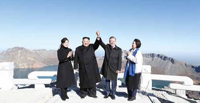 문재인 대통령과 북한 김정은 국무위원장이 20일 오전 백두산 정상인 장군봉에 올라 손을 맞잡고 들어 보이고 있다.