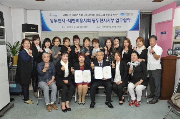 경기 동두천시와 대한미용사회 동두천시지부는 지난 21일 시민건강증진 향상을 위한 업무협약을 체결했다. 이번 업무협약 체결은 시와 대한미용사회 동두천시지부가 상호교류와 협력체계를 구축해 시민들의 건강에 대한 관심을 향상시키고, 지역내 건강분위기를 조성하기 위해 마련됐다. 사진은 관계자들이 기념촬영을 하는 모습. (사진제공=동두천시청)