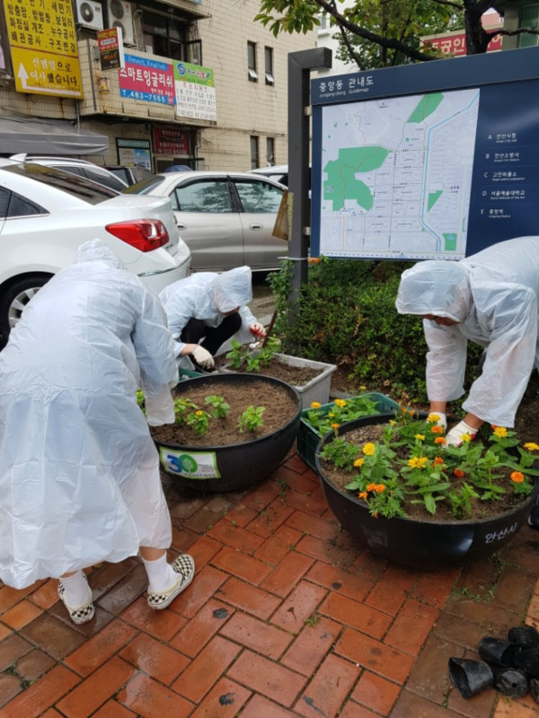 경기 안산시 중앙동 행정복지센터는 최근 동 행정복지센터 일원에 가을꽃 300본을 식재했다. 사진은 이날 행사에 참여한 행정복지센터 직원들이 꽃을 심고 있는 모습. (사진제공=안산시청)