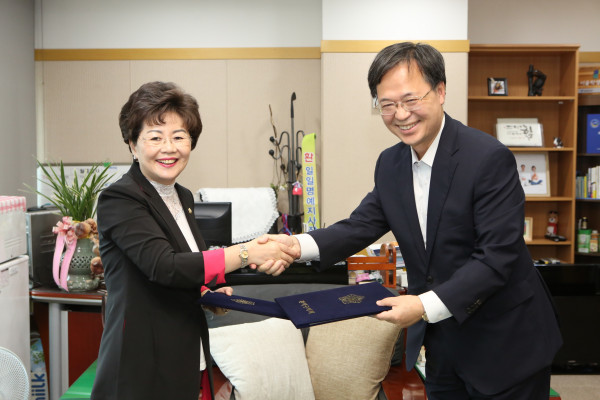 | ▲ 관악구의회 왕정순 의장(사진 왼쪽)이 상호협력 업무협약 체결 후 서울대 행정대학원 관계자와 악수를 나누고 있다. (사진제공=관악구의회) | ||