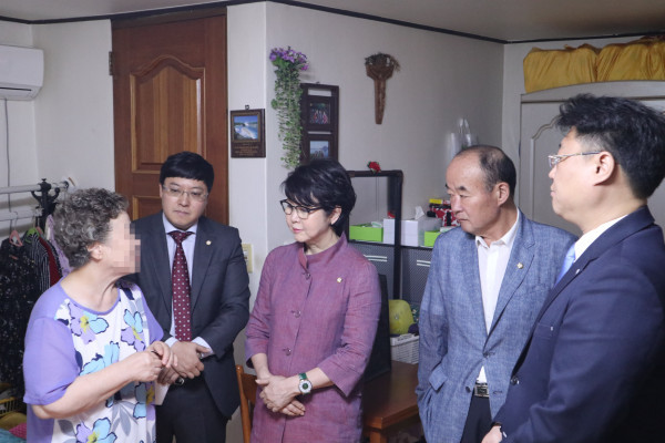 최근 이관수 의장, 이재민 부의장, 허주연 행정재경위원장, 최남일 복지도시위원장 등 서울 강남구의회 의상단이 추석 연휴 기간 동안 지역내 저소득 홀몸노인 가정을 방문해 온정을 나눴다. 사진은 한 홀몸노인 가정을 방문해 불편사항에 대해 이야기를 나누고 있는 의상단의 모습. (사진제공=강남구의회)