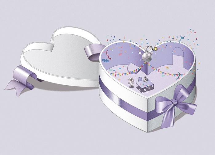 상자 속에는 마치 축제가 벌어진 듯 꽃가루가 휘날리는 가운데, 천장에 매달려있는 미러볼 모양의 폭탄이 보는 이들의 시선을 사로잡는다.