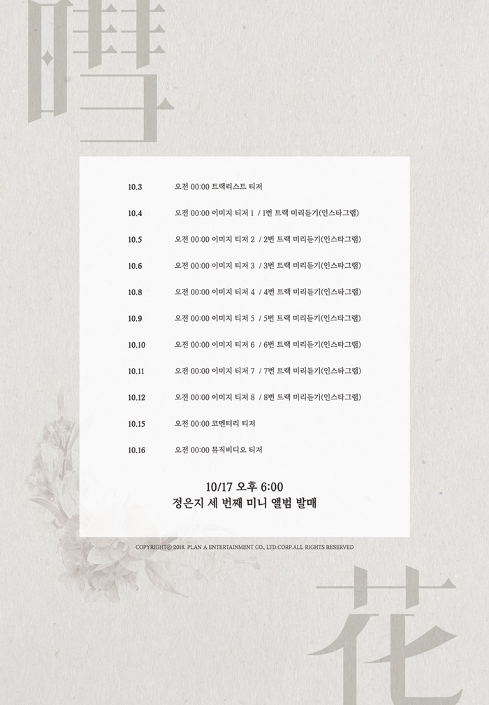 더불어 티저 오픈 일정과 함께 공개된 ‘정은지 세 번째 이야기, [혜화(暳花)] ; 별 반짝이는 꽃, Promotion Schedule, 2018.10.17 18:00’라는 문구가 혜화의 의미와 음반 발매 시점을 드러내 이목을 집중시켰다.