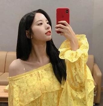 노란색 오프숄더 셔츠를 입은 보나는 청순하면서도 성숙한 분위기를 자아내고 있다. 머리를 길게 푼 헤어스타일링이 어우러지며 보나의 매력을 돋보이고 있다.