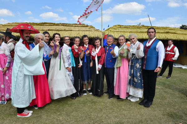 우석제 경기 안성시장은 10월3~7일 조선시대 남사당의 발상지인 지역의 특성을 반영해 진행중인 ‘안성맞춤 남사당 바우덕이 축제’ 행사장을 방문했다. 사진은 지난 5일 축제에 참석한 우 시장과 외국인들이 기념촬영을 하는 모습.(사진제공=안성시청)