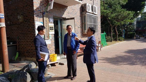 | ▲ 구립상일동경로당을 방문한 김남현 건설재정위원장(오른쪽)이 관계자들과 이야기를 나누고 있다. (사진제공=강동구의회) | ||