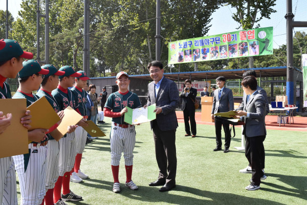 오승록 서울 노원구청장은 7일 공릉동 육군사관학교 야구장에서 열린 ‘제10회 노원구청장기 야구대회’에 참석했다. 사진은 오승록 구청장이 야구단원에게 표창을 수여한 후 기념촬영을 하는 모습. (사진제공=노원구청)