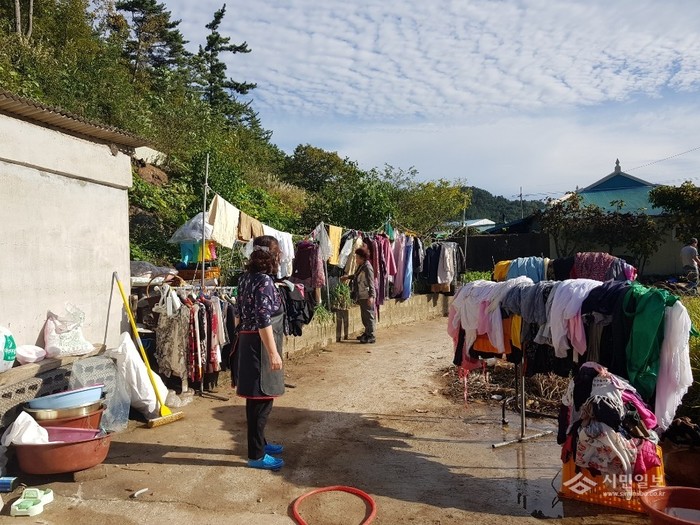 최근 발생한 제25호 태풍 콩레이 (KONG-REY)로 인해 경북 영덕군 축산 2리 마을회관 인근 농가들이 큰 피해를 입었다. 사진은 마을 주민들이 태풍으로 인해 젖어버린 이불과 옷가지들을 세탁하고 말리고 있는 모습.(사진=시민일보)