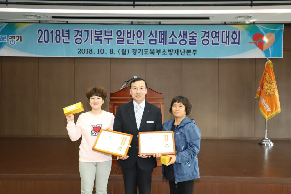경기 포천소방서 소속 김미경씨(여·51)와 조경화씨(여·47)가 지난 8일 양주소방서 대회의실에서 열린 ‘2018 일반인 심폐소생술 경연대회’서 ‘장려상’을 수상했다. 사진은 조씨(왼쪽)와 김씨 등 관계자들이 기념촬영을 하는 모습. (사진제공=포천시청)