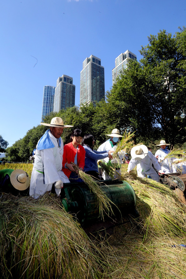 11일 서울 강남구가 대치동 영동 4교 부근 양재천 벼농사학습장에서 ‘양재천 가을걷이 체험행사’를 개최했다. 사진은 체험 행사에 참가한 초등학생들이 어른들의 도움을 받아 타작 체험을 해고 있는 모습. (사진제공=강남구청)