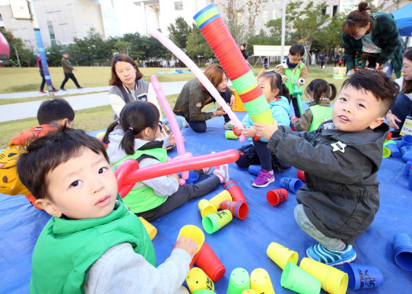 금천구가정어린이집연합회는 지난 12일 금나래공원에서 ‘한마당 큰잔치’를 개최했다. 사진은 행사에 참여한 어린이들이 ‘컵쌓기’ 부스에서 자신이 쌓은 컵을 높이 들어 보이고 있는 모습. (사진제공=금천구청)