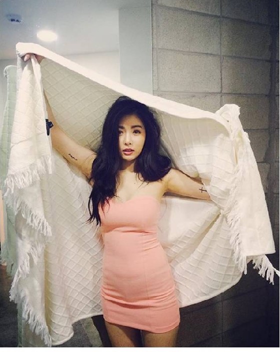 현아는 과거 자신의 SNS에 사진을 공개했다. 공개된 사진에는 핑크색 튜브 드레스를 입고, 담요를 번쩍 치켜든 채 완벽한 몸매를 뽐내고 있는 현아의 모습이 담겨 있다.