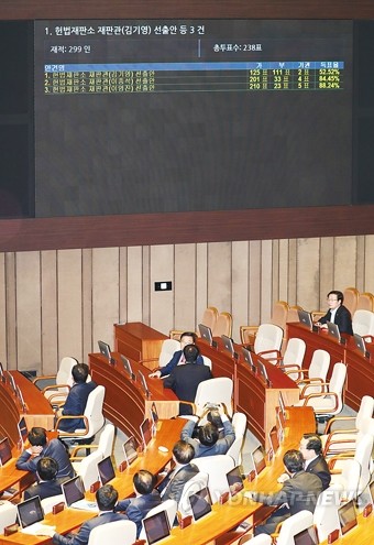 17일 오후 헌법재판관 김기영, 이종석, 이영진 후보자 3명에 대한 선출안이 국회 본회의를 통과하고 있다.