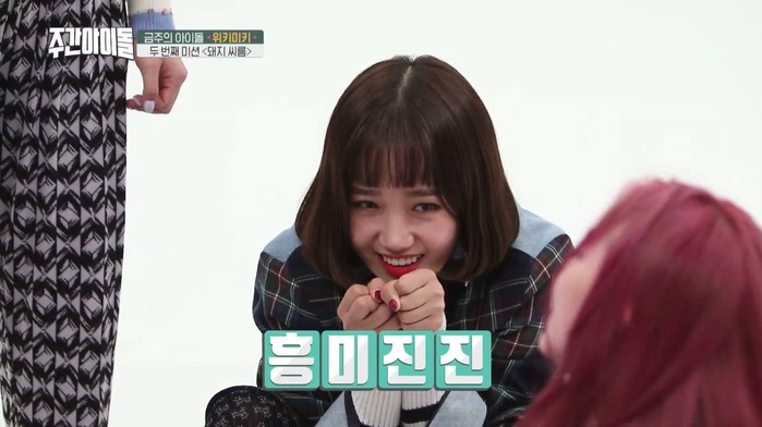 이어 위키미키의 틴크러시를 확인할 수 있는 ‘돼지 씨름’이 진행됐는데, 막내 루시는 언니들에게 "사과를 쪼갤 수 있듯이 언니들도..." 라며 위아래 없는 살벌한 경고장을 보내 언니들을 벌벌 떨게 만들었다. 또한, 격렬한 승부의 증거로 멤버 한 명의 머리카락 뭉치가 발견되어 말로만 듣던 무시무시한 걸그룹 파워를 증명했다는 후문.