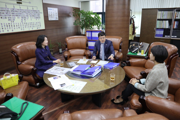 17일 서울 강남구의회 이관수 의장이 의장실에서 이지현 비상대책위원(바른미래당), 이도희 강남구의원과 함께 지역현안에 대해 의논을 하고 문제 해결을 위해 정당을 초월해 협력할 것을 다짐했다. 사진은 이관수 의장(가운데)이 이지현 위원, 이도희 의원과 함께 지역현안에 대해 논의를 하고 있는 모습. (사진제공=강남구의회)
