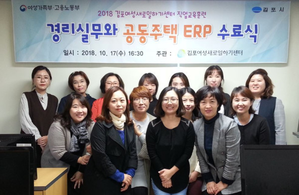 경기 김포시는 지난 17일 교육강사 및 훈련생 등 20명이 참석한 가운데 '경리실무와 공동주택ERP 과정' 수료식을 개최했다. 사진은 수료식이 끝난 후 수료생들이 기념촬영을 하고 있는 모습. (사진제공=김포시청)