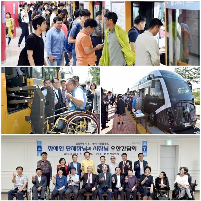 | ▲ (왼쪽 상단부터 시계방향으로) 인천지하철 2호선 인천시청역 전경, 청라국제도시에서 운영되고 있는 바이모달 트램의 시승식이 진행중인 모습, 박 시0장이 지난 8월 장애인단체장과 간담회를 진행한 후 참석자들과 기념촬영을 하는 모습, 장애인전용버스에 탑승하는 지역주민의 모습.(사진제공=인천시청) | ||