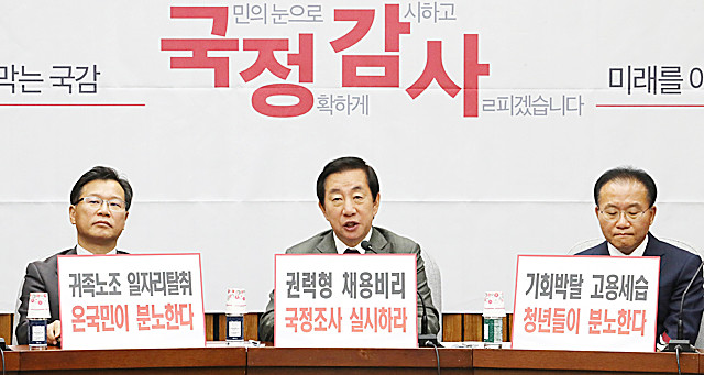 자유한국당 김성태 원내대표(가운데)가 19일 오전 국회에서 열린 국정감사 대책회의에서 발언하고 있다. /연합뉴스