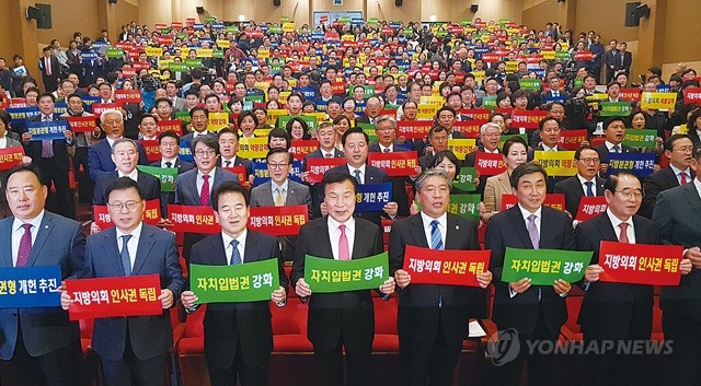 전국시·도의회의장협의회 주관으로 22일 국회의원회관에서 ‘지방분권 촉구 결의대회’가 진행됐다. 사진은 결의대회에 참석한 바른미래당 손학규 대표와 민주평화당 정동영 대표를 비롯한 국회의원과 전국 시·도의회의원들이 ‘지방의회 역량강화’를 주제로 한 손피켓을 들고 구호를 외치고 있는 모습.