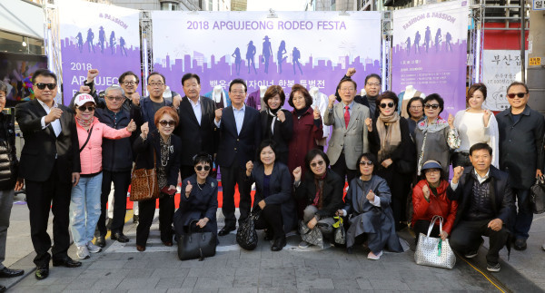 최근 서울 강남구 압구정로데오 거리에서 ‘2018 압구정로데오 페스타’가 개최됐다. 이번행사에는 김기수, 최겨울 등 유명 뷰티·패션 유튜브 크리에이터들 등이 참여했다. 사진은 정순균 구청장이 백옥수 디자이너의 한복 특별전 관람 후 시민들과 함께 기념촬영을 하고 있는 모습. (사진제공=강남구청)