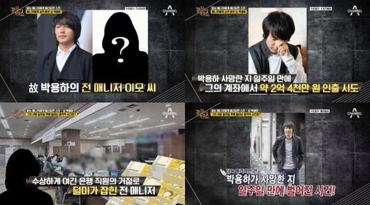 패널로 출연한 프리랜서 김묘성 기자는 "당시 검찰에 따르면, 매니저 이모 씨는 당시 일본 도쿄의 한 은행을 찾았고, 故 박용하 씨로부터 정당하게 위임을 받은 척하며 예금청구서를 내밀었다. 한화로 2억 4천만 원의 돈을 인출하려 했지만, 이를 수상하게 여긴 직원의 지급 거절로 미수에 그쳤다"고 언급했다.
