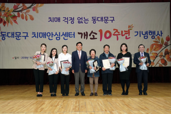 | ▲ 23일 오후 2시, 동대문구청 2층 다목적강당에서 진행된 치매안심센터 개소 10주년 기념행사에 참석한 유덕열 구청장(왼쪽에서 네 번째)이 표창자들과 함께 기념촬영을 하고 있다. (사진제공=동대문구청) | ||