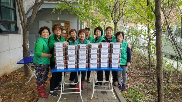 경기 안산시 와동 새마을부녀회는 24일 저소득 50가구에 파김치를 전달했다. 이날 부녀회원들은 아침 일찍부터 부녀회사무실에 모여 풀을 쑤고, 파를 다듬으며 파김치를 담갔으며, 담근 파김치는 회원들이 직접 노인과 장애인 가구에 전달하며 안부도 확인했다. 사진은 참여자들이 기념촬영을 하는 모습. (사진제공=안산시청)