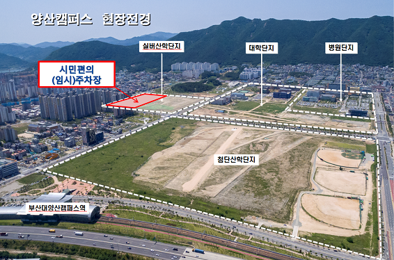 임시주차장이 조성된 부산대 양산캠퍼스 실버산학단지는 물금신도시 한가운데 있는 부지로 10여 년째 유휴지로 방치되면서 도심미관 훼손은 물론 비산먼지 유발 등의 민원이 잦았던 곳이다.