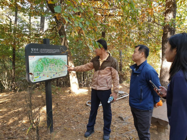 경기 수원시 권선구 녹지공원과장과 직원 4명은 25일 가을철 산불 예방활동과 체계적인 산불 대응을 위한 칠보산 등산로 현장 소통 점검을 실시했다. 사진은 관계자들이 칠보산(칠보약수터~칠보산, 정상~용화사) 등산로 주요구간 위치를 파악하고 있는 모습. (사진제공=권선구청)