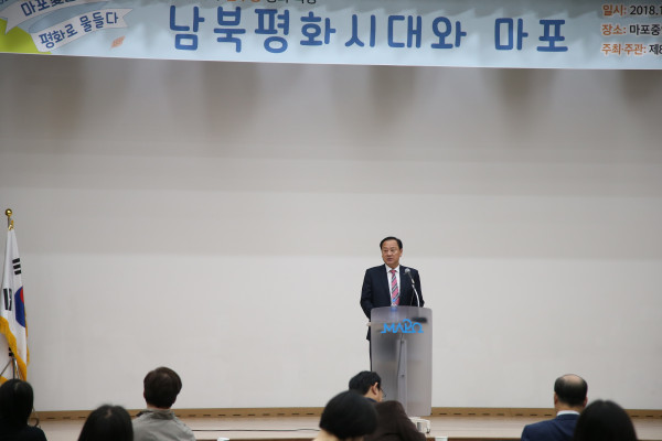 유동균 서울 마포구청장은 지난 27일 마포중앙도서관에서 열린 ‘제8회 마포동네책축제’에 참석했다. 이번 책축제는 한반도 평화 분위기와 함께 민선7기 남북화해의 중심도시로 발전하기 위한 여정에서 마포구가 평화를 주제로 주민들과 공감하고 미래를 대비하기 위한 의도로 기획됐다. 사진은 유 구청장이 인사말을 하고 있는 모습. (사진제공=마포구청)