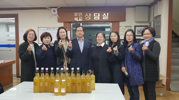 경기 여주시 북내면 여강중학교 학부회는 지난 26일 북내면사무소를 방문해 지역내 저소득 취약계층과 복지시설에 전달해달라며 직접 담근 매실청 25병을 기탁했다. 사진은 기탁식 후 관계자들이 기념촬영을 하는 모습. (사진제공=여주시청)