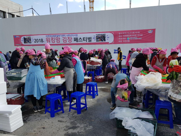 경기 이천시는 지난 27일 이천여성새로일하기센터 주관·주최, 이천신용협동조합 후원으로 ‘워킹맘 김장페스티벌’을 개최했다. 사진은 김장페스티벌에 참석한 자원봉사자들이 배추에 김장소를 버무리고 있는 모습. (사진제공=이천시청)