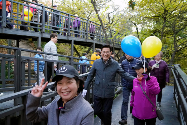 서울 동대문구가 지난 27일 배봉산 둘레길 개통식을 성황리에 개최했다. 구의 유일한 녹지 공간인 배봉산에 조성한 둘레길은 출발과 도착지점이 같은 순환형이다. 사진은 배봉산 둘레길 개통 기념 걷기행사에 참석한 유덕열 구청장이 주민들과 함께 걷고 있는 모습. (사진제공=동대문구청)