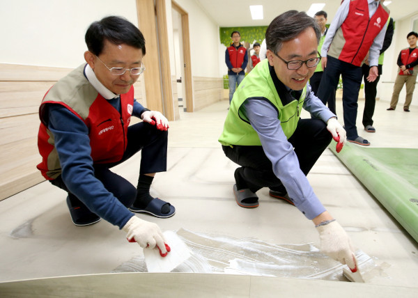 금천구는 롯데건설과 함께 지역내 사회복지시설 3곳에 대한 환경개선사업을 완료하고, 이를 기념하기 위한 현판식을 진행했다. 사진은 29일 하누리 장애인 주간보호시설 환경개선사업 완료기념 현판식에 앞서, 유성훈 구청장(오른쪽)과 하석주 롯데건설 대표이사가 장판교체 작업을 하고 있는 모습. (사진제공=금천구청)