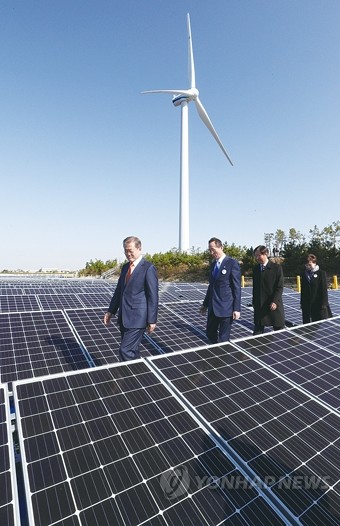 문재인 대통령은 이날 전북 군산 유수지 수상태양광 발전소에서 열린 새만금 재생에너지 비전 선포식에 참석, “새만금 재생에너지 비전선포식은 전북 새만금을 명실공히 대한민국 재생에너지 중심지로 선포하는 날”이라고 말했다. 사진은 문 대통령이 송하진 전북도지사, 관계 장관들과 함께 수상태양광 시설을 둘러보고 있는 모습.
