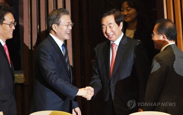 문재인 대통령이 1일 오전 국회 본회의장에서 내년도 예산안에 대한 시정연설을 마친 뒤 나오며 자유한국당 김성태 원내대표와 인사하고 있다.
