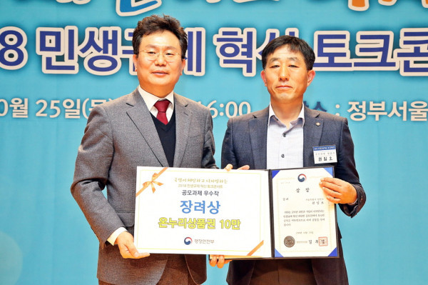 양천구의 ‘지하비상구 건물출구와의 거리 표기’가 행정안전부가 주관하는 ‘국민이 제안하고 디자인하는 민생규제혁신과제 공모전’에서 행안부 장관상을 수상했다. 사진은 관계자들이 시상식에서 기념촬영을 하는 모습. (사진제공=양천구청)