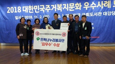 | ▲ 뜨락누리 봉사단 단체부문 최우수수상사진 김해시(시장 허성곤)는 지난2일 국회의사당 도서관에서 개최한 「제1회 대한민국 주거복지문화대상」에서 뜨락 나누리 봉사단이 단체부문 “최우수상”에 수상했다고 밝혔다. 「대한민국 주거복지문화대상」은 주거복지공동체를 만들기 위해 노력하는 단체와 기관 및 시민을 발굴하고 전국 주거복지활동 중 우수사례를 선정해 확산, 전파하고자 실시하였다. 올해 첫 시행인 대회로, 주거복지문화운동본부가 주최하고 행정안전부와 국회 국토교통위원회, 문화체육관광위원회, 보건복지위원회, 여성가족위원회가 후원한다. 전국 51개 기관 및 단체가 참여하여 1차 서류심차에서 28개 단체 및 기관을 선정하고 2차 현장확인 후 최종 선정되었다. 최우수상을 수상한 ‘뜨락나누리봉사단’은 2004년 결성되어 23명의 회원이 매월 도배, 장판 등 집수리 봉사활동을 하고, 밑반찬을 지원하는 등 주거환경 개선과 소외이웃을 위해 자원봉사와 나눔을 실천하고 있다. 뜨락나누리봉사단 단장 박영애씨는 지난 10월 ‘2018 대한민국 나눔국민대상’에서 국민훙장 동백장을 수여한 바 있다. |