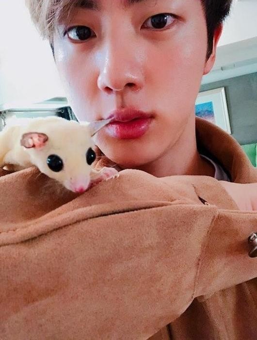 공개된 사진 속에서 진은 자신이 키우고 있는 슈가글라이더 ‘오뎅이’, ‘국물이’를 자신의 팔에 올려 놓고 다정한 포즈를 취하고 있다. 특히 두 마리의 슈가글라이더는 앙증맞은 몸집에 큰 눈으로 눈길을 끈다.