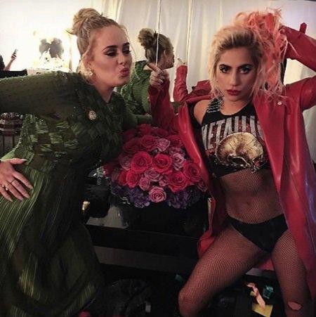 지난해 2월 13일 레이디 가가는 자신의 SNS에 아델과 함께 찍은 사진을 게재했다. 아델과 레이디 가가는 그래미 어워드 대기실에서 꽃다발을 사이에 두고 자유분방한 포즈를 취하고 있다. 레이디 가가의 파격적인 의상이 시선을 사로잡았다.