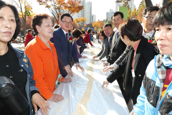 경기 평택시는 지난 3일 시청 앞 분수광장에서 약 5000여명의 시민이 참석한 가운데 음식문화 경연대회를 개최했다. 사진은 시민의 화합의 장을 만드는 '인절미 100m 잇기 퍼포먼스'가 진행 중인 모습. (사진제공=평택시청)
