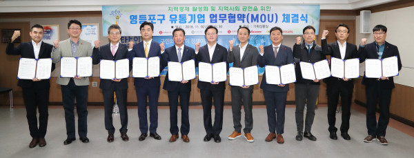 영등포구는 지난 2일 구청 기획상황실에서 지역내 유통기업들과 ‘지역경제 활성화와 지역사회 공헌을 위한 업무협약’을 체결했다. 사진은 업무협약식에 참석한 채현일 구청장과 유통기업 관계자들이 협약서를 들고 기념촬영을 하는 모습. (사진제공=영등포구청)