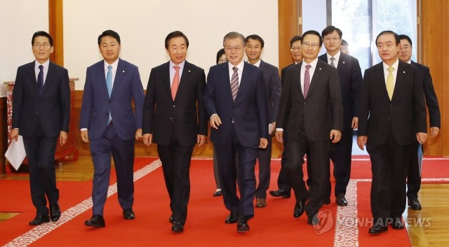 문재인 대통령이 5일 청와대에서 여야 5당 원내대표들과 여야정 상설협의체 첫 회의를 하기 위해 함께 입장하고 있다. 왼쪽부터 정의당 윤소하 원내대표, 바른미래당 김관영 원내대표, 자유한국당 김성태 원내대표, 문 대통령, 더불어민주당 홍영표 원내대표, 민주평화당 장병완 원내대표.