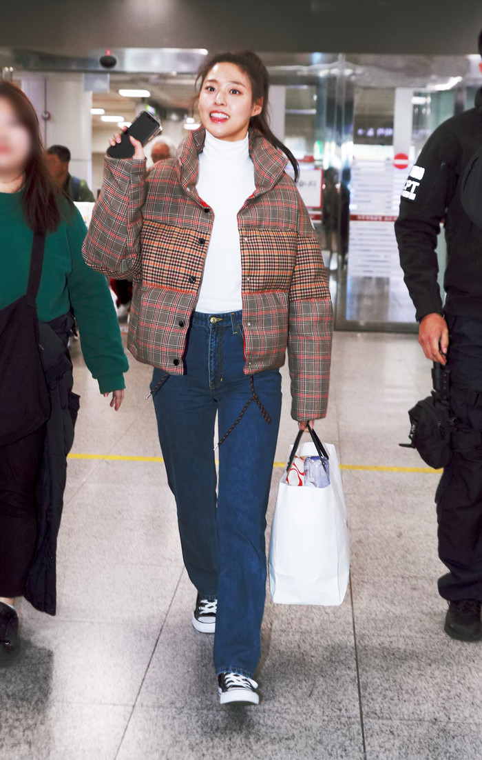 여기에 글랜체크 패턴이 배색된 다운 재킷을 포인트로 감각적이고 캐주얼한 무드의 공항패션을 완성했다.