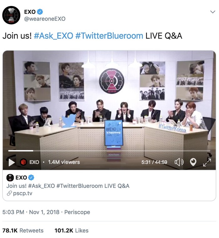 지난 1일 오후 5시, 트위터가 전 세계에 생중계한 보이 그룹 엑소(EXO)의 ‘EXO COMEBACK EXO’s ROOM Live’가 140만의 조회수를 기록했다.