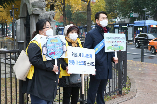 7일 김영종 종로구청장이 광화문 일대에서 열린 ‘미세먼지 줄이기 캠페인’에 서울시 관계자들과 함께 참석해 ▲미세먼지 비상저감조치시 차량 2부제 참여 및 대중교통 이용 ▲주민 행동 요령 등의 캠페인을 펼쳤다. 사진은 마스크를 쓴 김 구청장(오른쪽)이 피켓을 들고 캠페인을 펼치고 있는 모습. (사진제공=종로구청)